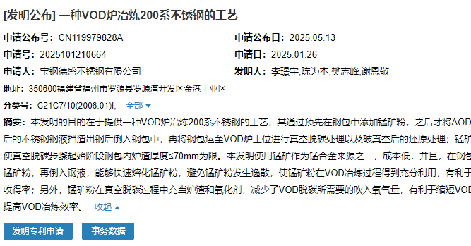 2025年5月13日,寶鋼德盛不銹鋼有限公司成功申請一項(xiàng)名為“一種VOD爐冶煉200系不銹鋼的工藝”專利,申請公布號為CN119979828A,申請日期為2025年1月26日。
