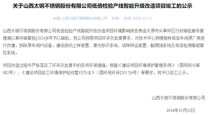 2024年10月21日,山西太鋼不銹鋼股份有限公司低倍檢驗產線智能升級改造項目竣工公示。