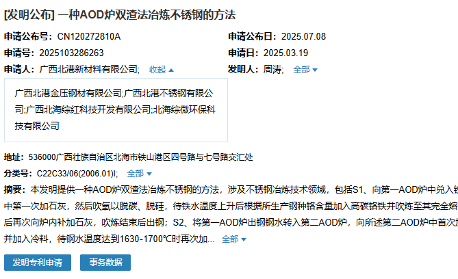 2025年7月8日,廣西北港新材料有限公司聯(lián)合廣西北港不銹鋼有限公司等多家公司成功申請一項名為“一種AOD爐雙渣法冶煉不銹鋼的方法”專利,申請公布號為CN120272810A,申請日期為2025年3月19日。